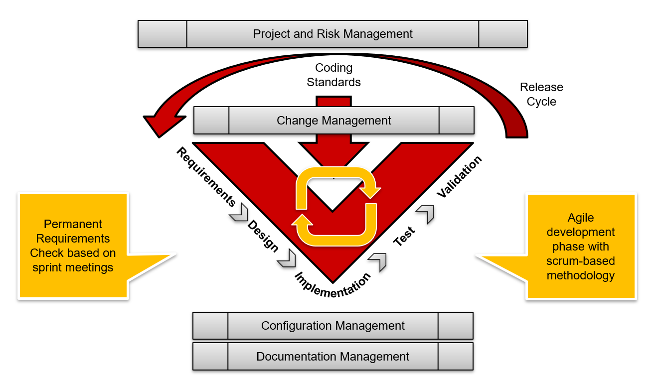 Sie wird in ihrem V-Modell-basierenden Teil von einem fortlaufenden Change-Management unterstützt und in jeder Phase vom Projekt- und Risiko-Management überwacht. Die Implementierung erfolgt auf Basis unserer Coding-Standards.